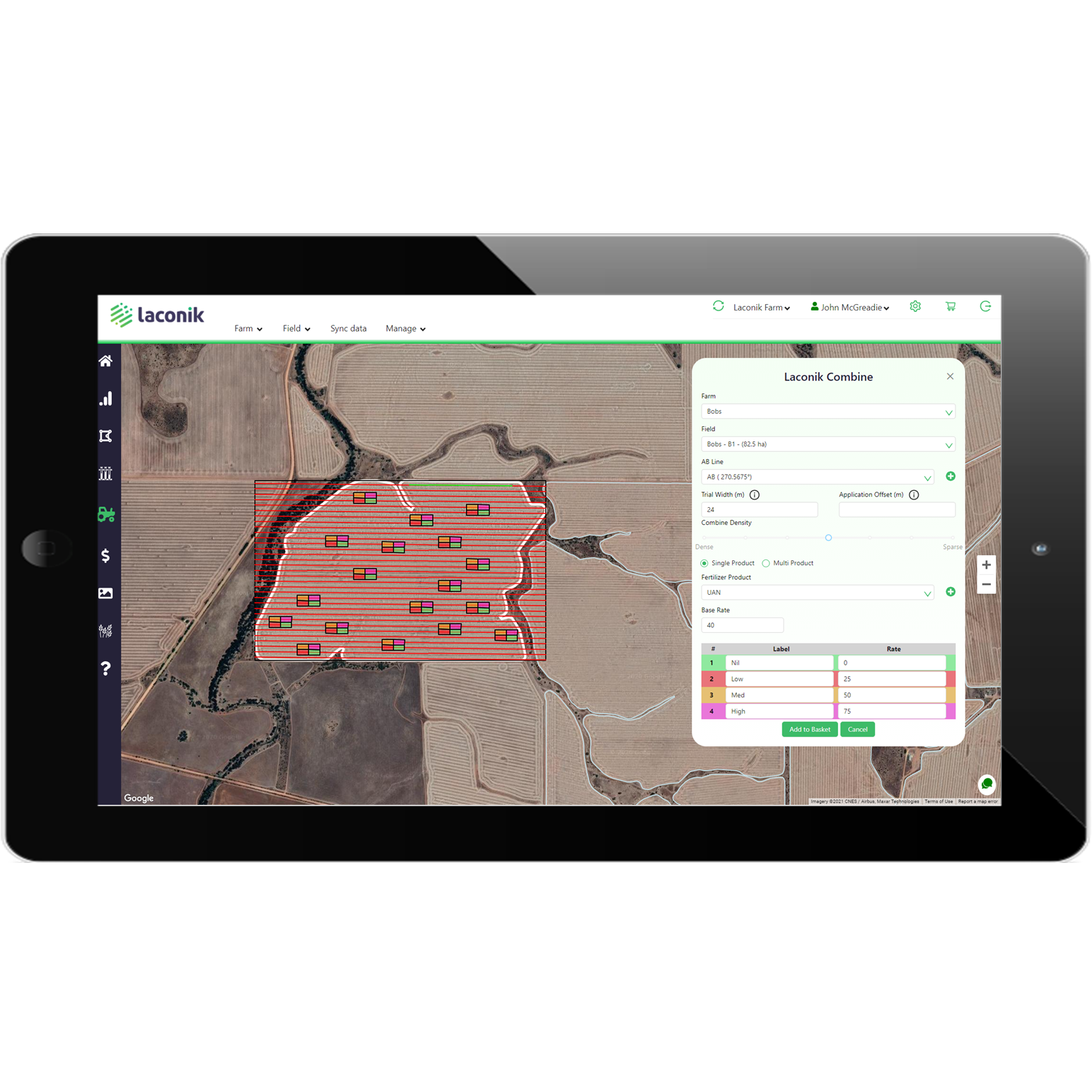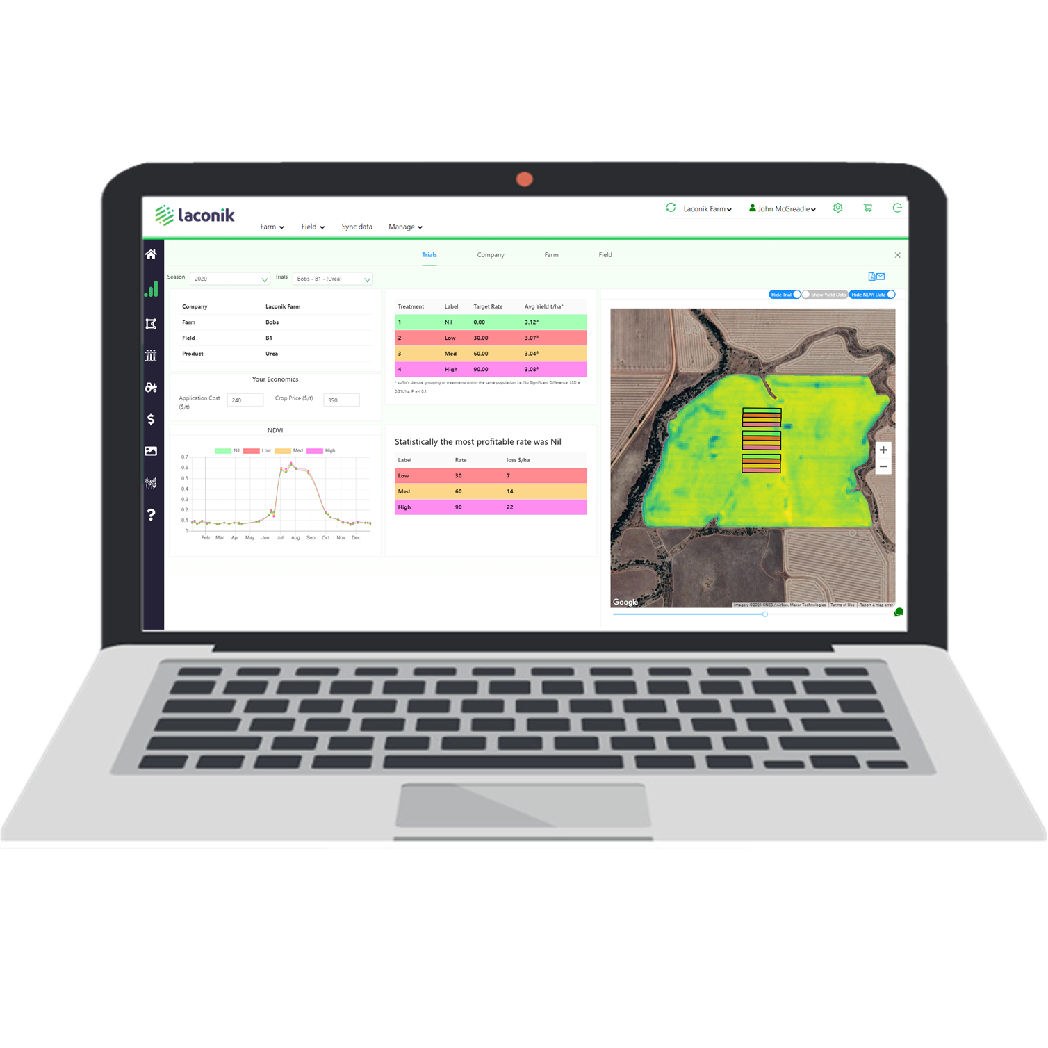 Laconik provides technology which enables on-farm trials to be created with ease, data collected efficiently and the analysed results reported back to you on time. We use hardware and software that integrates with modern farm machines to put a trial in a paddock which provides you with the information that matters most.